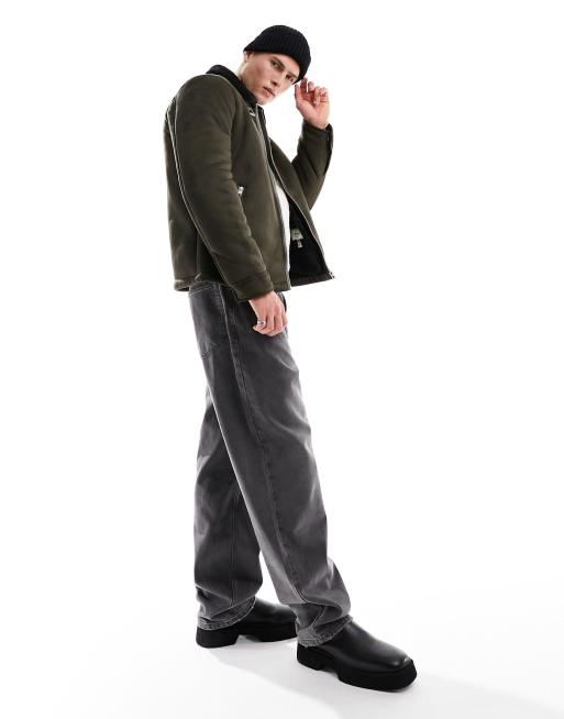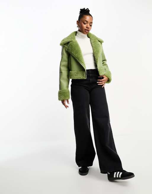Dark green aviator jacket cheap, Urbancode cropped aviator jacket with borg trims in green ASOS cheap
