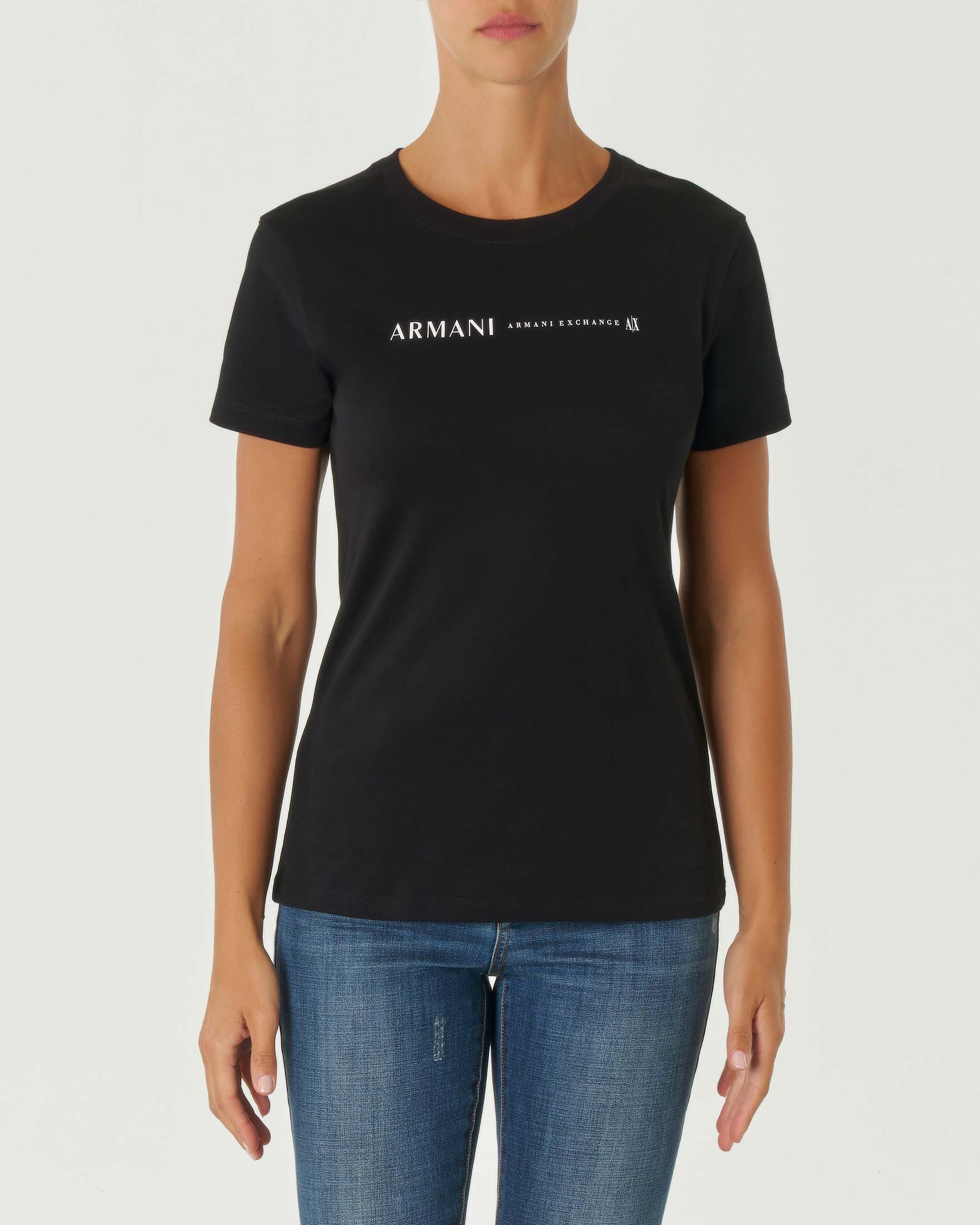 T shirt nera in cotone a maniche corte con doppia scritta logo stampata a contrasto di colore