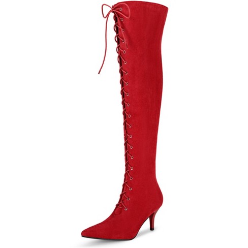 Allegra K Women s Lace Up Stiletto Heel Over the Knee High Boots Red 7