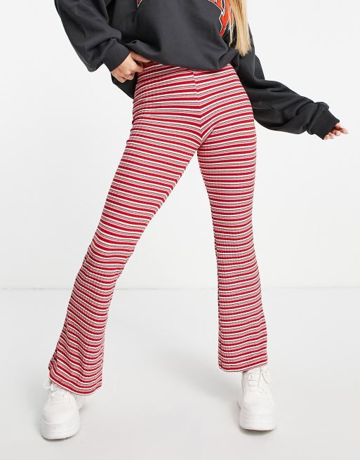 Mid Rise Fold Over Waistband Flared Trousers In Red Stripe Crochet Knit EGO